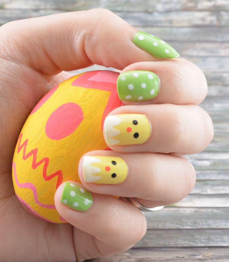 Soft yellow chick designs sit on accent nails while bright green polka dot nails add a playful contrast. The look feels fun, colorful, and perfectly inspired by cheerful Easter decorations.