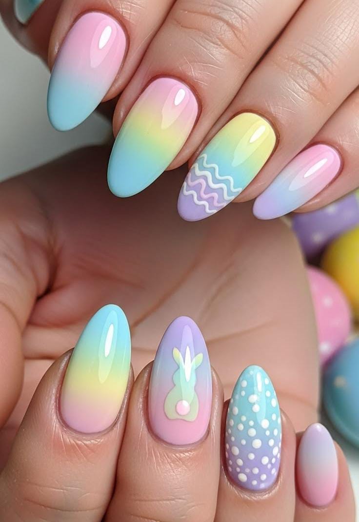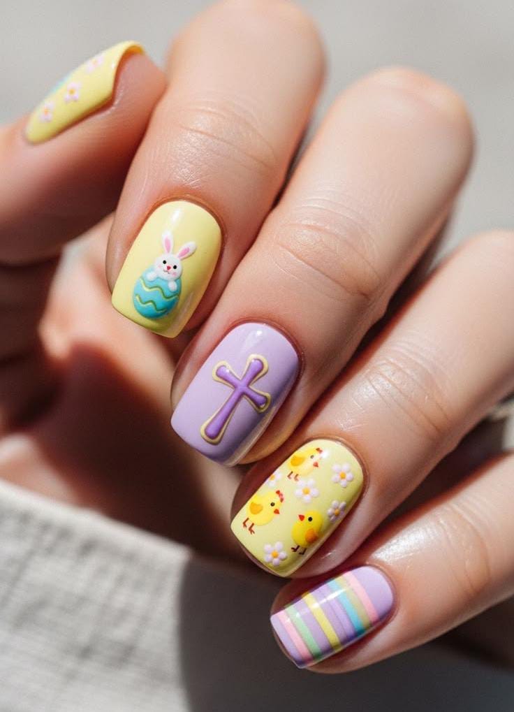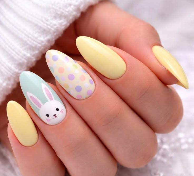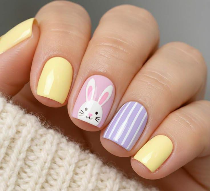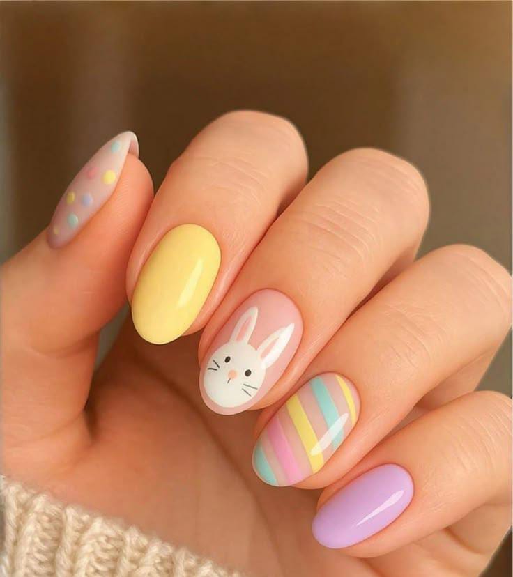 Soft pastel shades like yellow, lavender, and nude create a cheerful Easter look with a cute bunny accent. The mix of polka dots and pastel stripes adds a playful, springtime vibe.