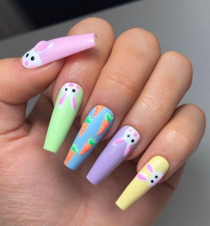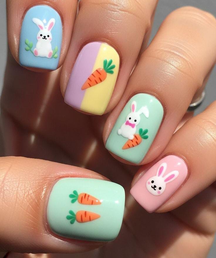 Pastel nails in soft yellow, mint, lavender, pink, and blue create a cheerful spring palette. Cute bunny faces and carrot patterns give the design a playful and adorable Easter vibe.