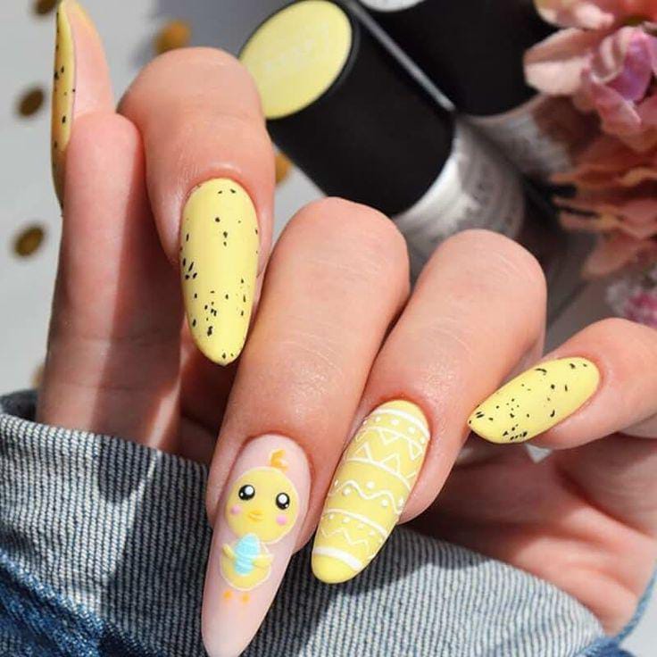 Soft pastel yellow nails are paired with tiny speckles and a sweet chick accent for a playful Easter look. The design feels bright, fun, and perfectly festive for spring.