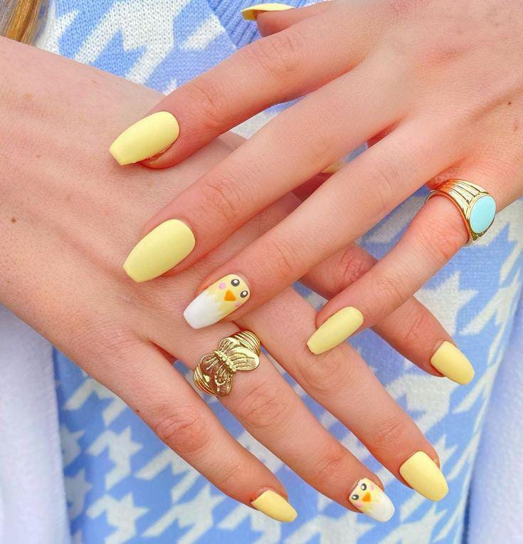 Soft pastel yellow nails create a cheerful spring look, with a white accent nail featuring a tiny chick design. The overall style feels playful, bright, and perfectly festive for Easter.