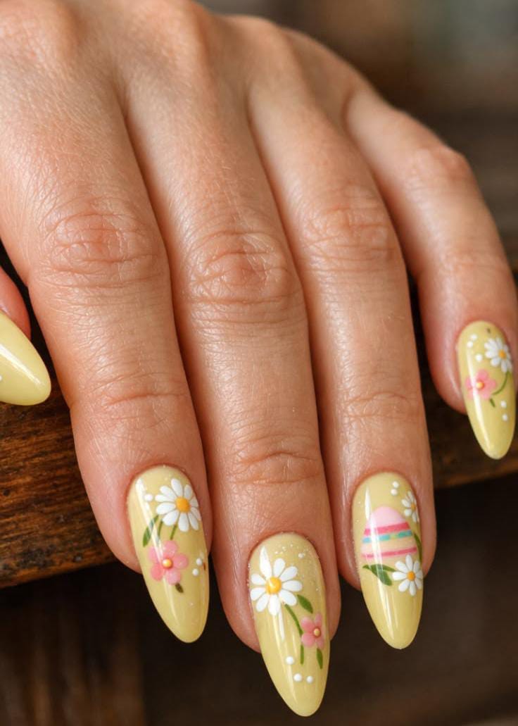Pastel yellow almond nails are decorated with delicate white daisies and soft floral details for a fresh spring vibe. The design feels light, elegant, and inspired by a blooming Easter garden. 🌼🐣