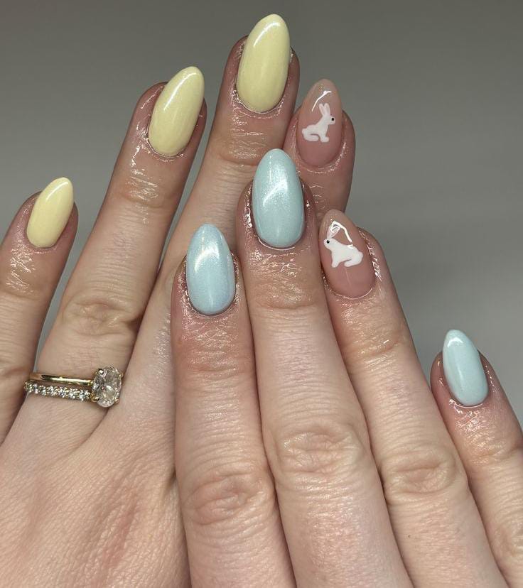 Soft pastel yellow and baby blue nails create a sweet Easter color palette with a glossy finish. The look is completed with nude accent nails featuring tiny white bunny designs for a cute festive touch.