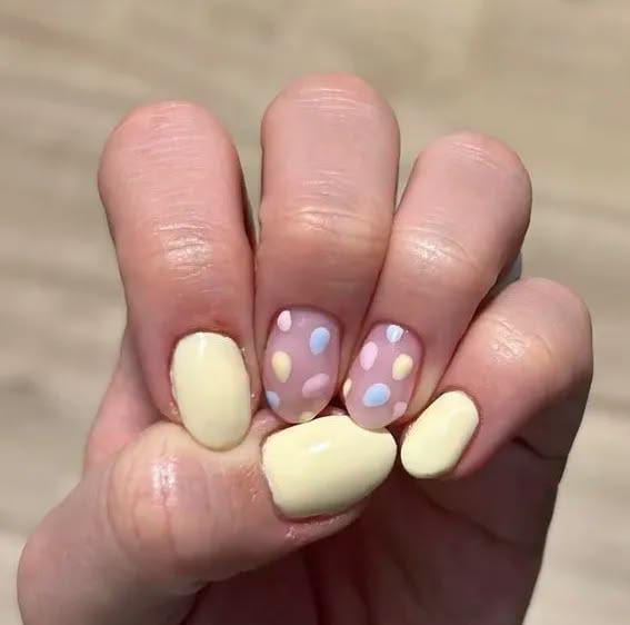 Light pastel yellow nails are paired with sheer pink accent nails decorated with soft pastel polka dots. The design feels playful, minimal, and perfectly inspired by colorful Easter eggs. 🐣✨