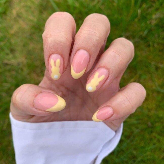 Sheer pink nails feature soft pastel yellow French tips and tiny bunny silhouettes for a subtle Easter look. The design feels minimal, sweet, and perfect for a soft spring style.