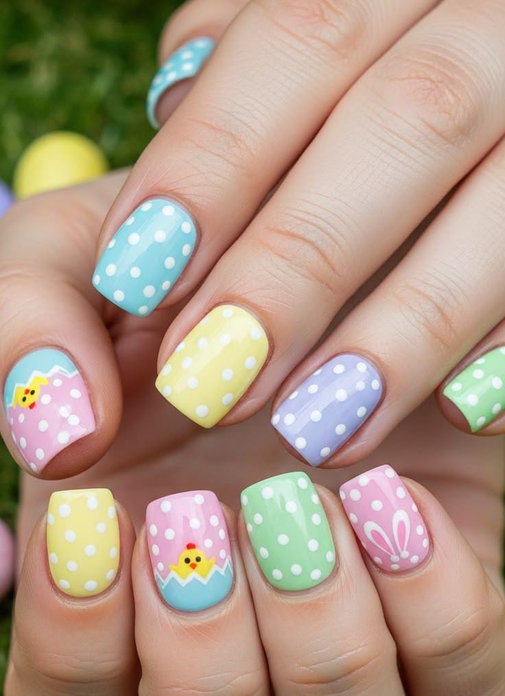 This colorful manicure combines pastel yellow with soft blue, pink, lavender, and mint shades decorated with white polka dots. The cheerful chick and cracked egg accents give the design a fun and festive Easter feel. 🐣