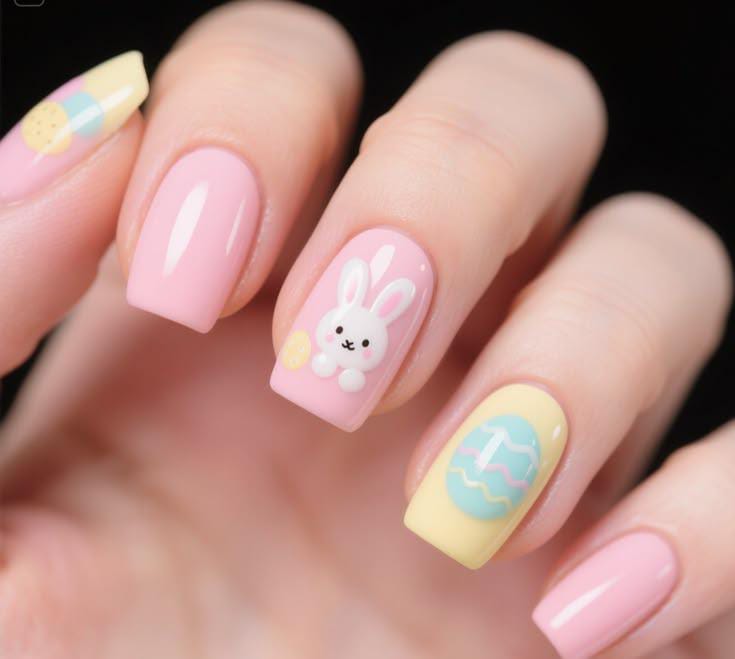 These soft pastel nails feature a glossy pink base with adorable Easter accents like a tiny bunny and a decorated egg. The gentle pastel yellow and blue details give the design a cute and playful spring vibe.