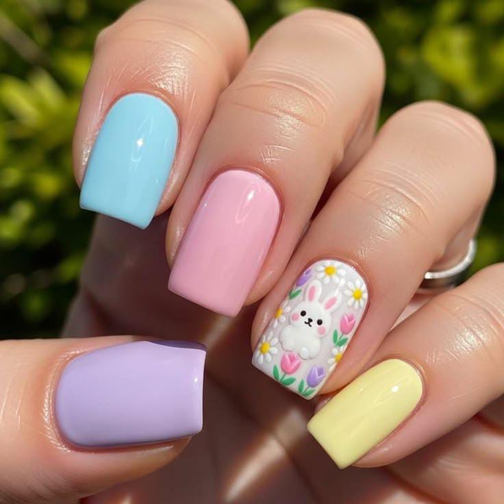 Simple pastel nails in soft blue, pink, lavender, and yellow create a fresh spring palette. The bunny accent surrounded by tiny flowers gives the design a sweet Easter garden vibe.