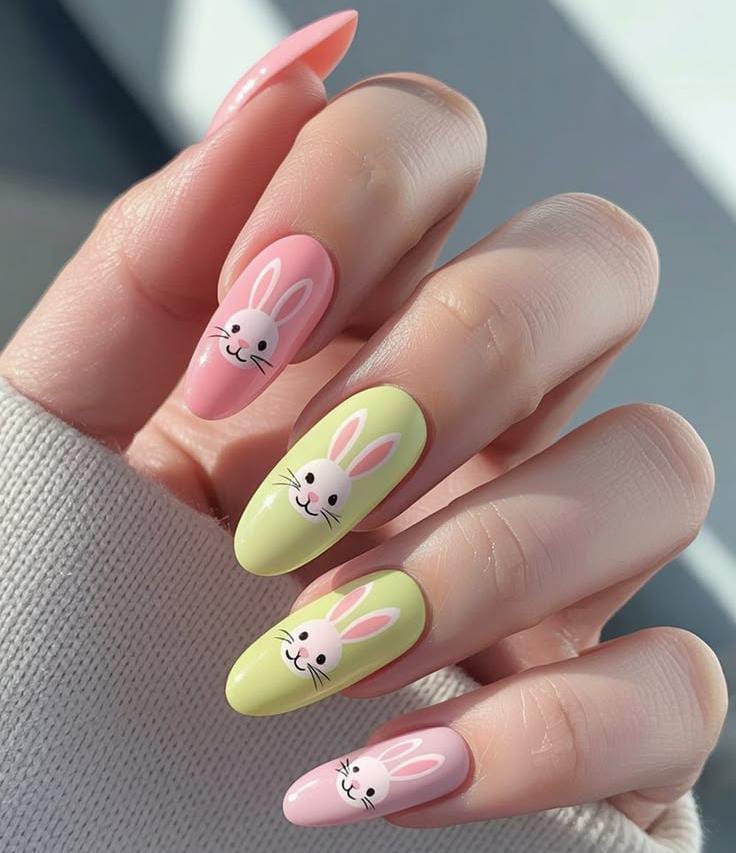 Soft pastel pink and yellow nails feature adorable bunny faces that give the design a playful Easter charm. The simple colors and cute character accents create a sweet and cheerful spring look.