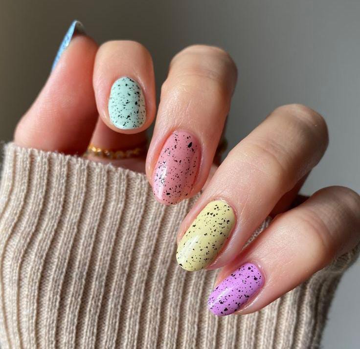 Muted pastel shades like mint, pink, yellow, and lavender create a soft spring palette. The black speckled pattern gives the nails a fun Easter egg–inspired look.