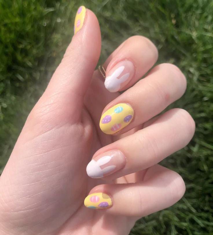 Soft pastel yellow nails with tiny colorful egg-like dots create a playful Easter vibe, while accent nails feature cute white bunny silhouettes. The mix of pastel colors and simple holiday motifs makes the design look cheerful, fresh, and perfect for spring.