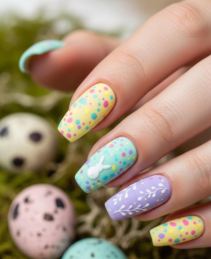 Pastel yellow, blue, and lavender nails are decorated with bright polka dots that resemble painted Easter eggs. A small white bunny accent and delicate leafy pattern give the design a cheerful and artistic spring vibe.