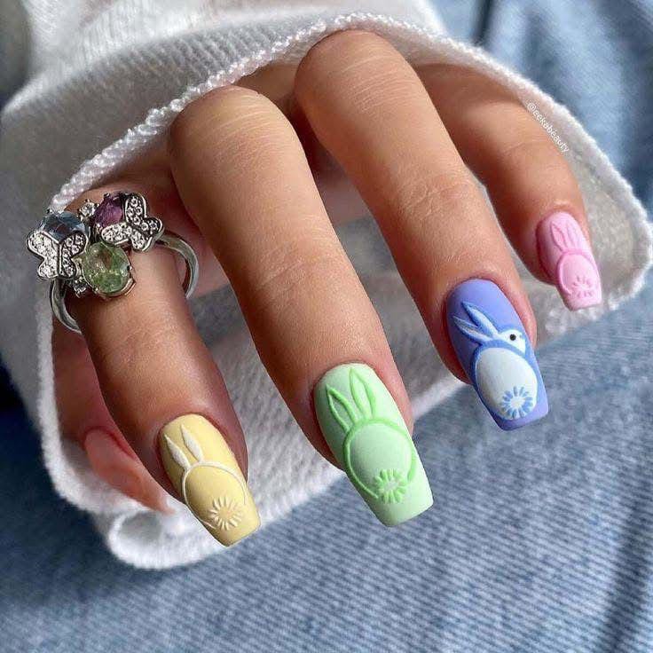 Matte pastel nails in soft yellow, green, blue, and pink create a bright Easter palette. Raised bunny designs give the manicure a fun, textured look that feels festive and adorable.