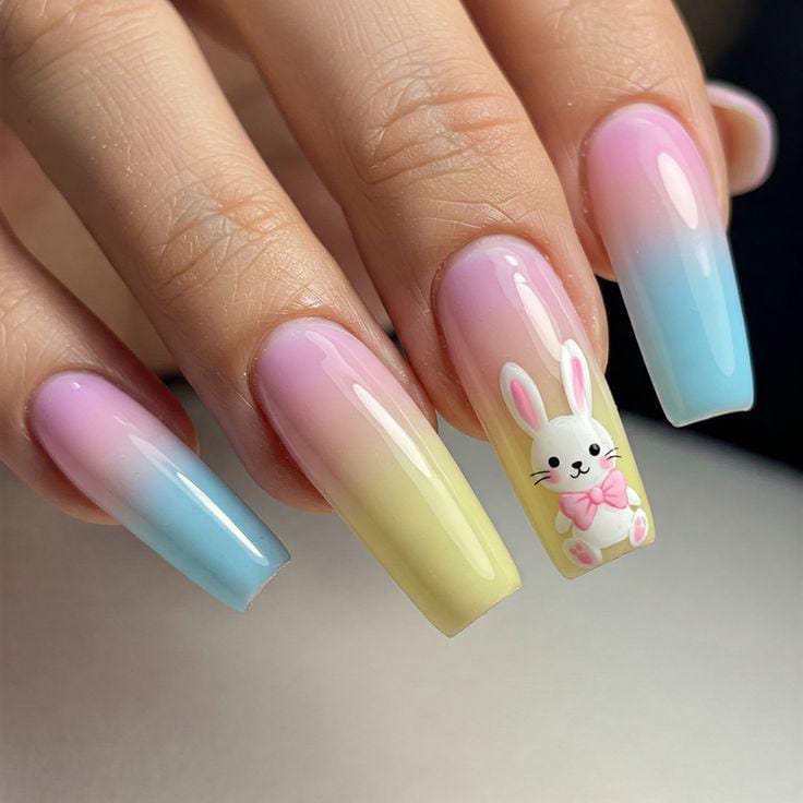 A dreamy pastel ombre blends pink, yellow, and blue shades across glossy square nails for a soft Easter look. A cute bunny accent nail adds a sweet and festive touch to the gentle spring colors.