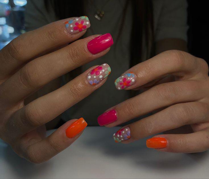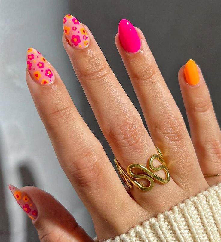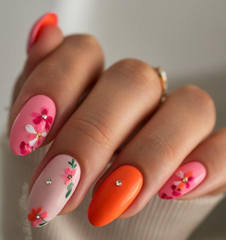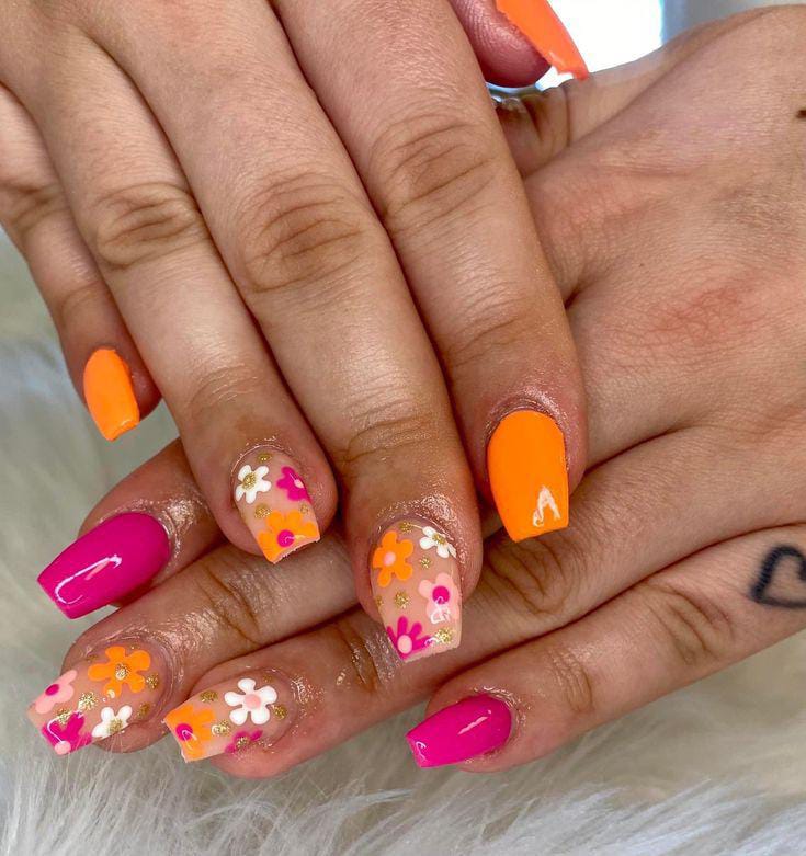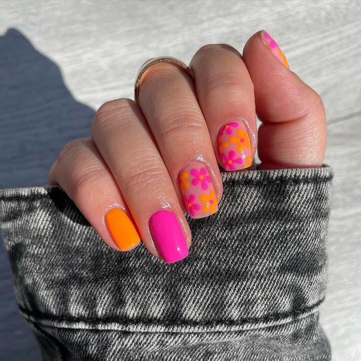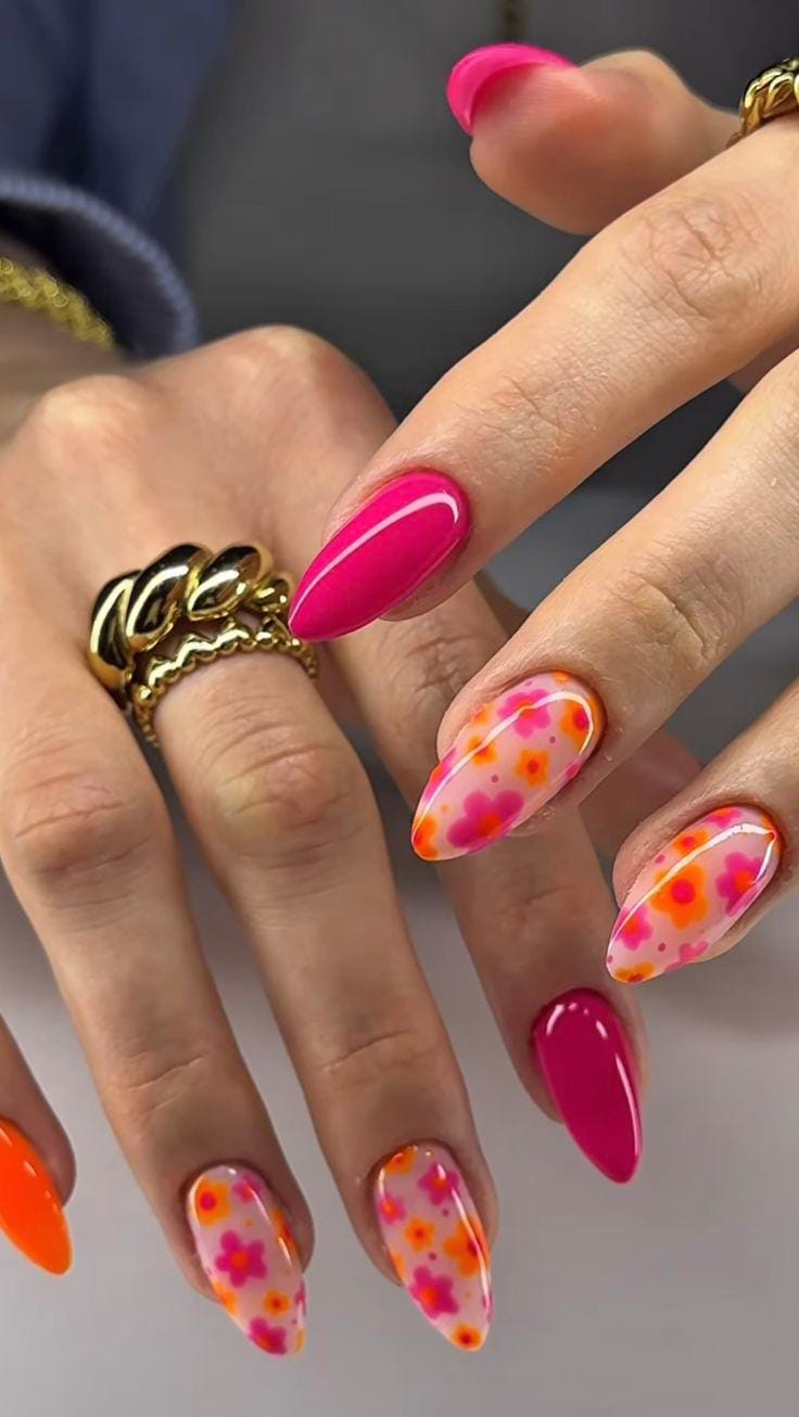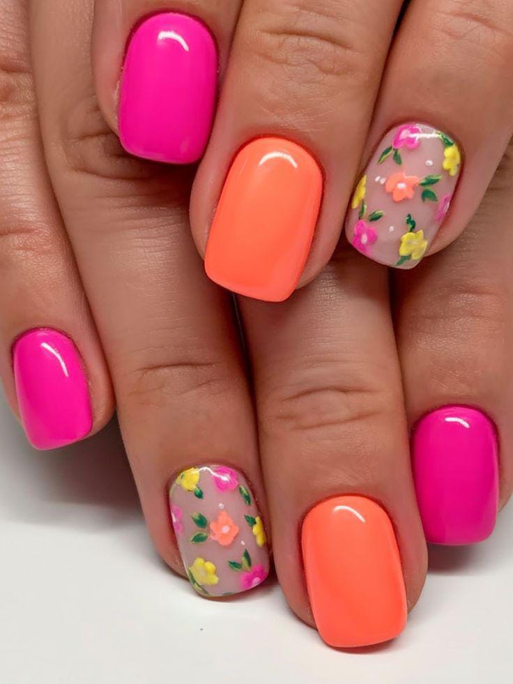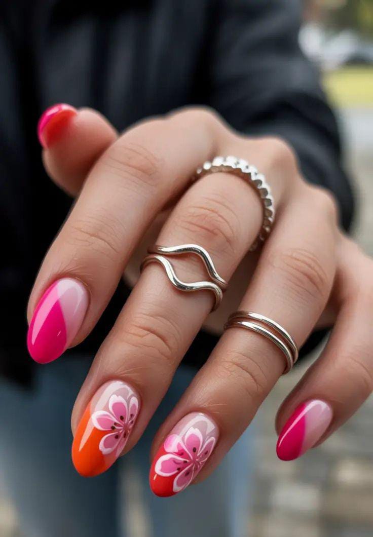 A combination of bright pink and orange nails with soft floral patterns in shades of pink and orange on natural accents, offering a fun and trendy spring vibe with a touch of elegance.