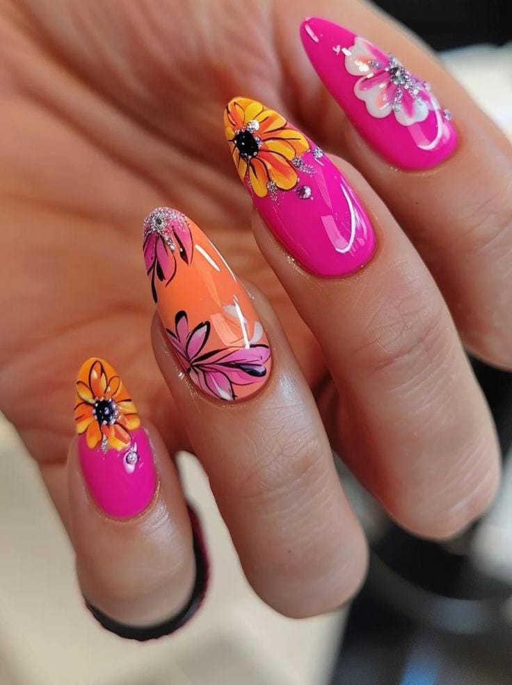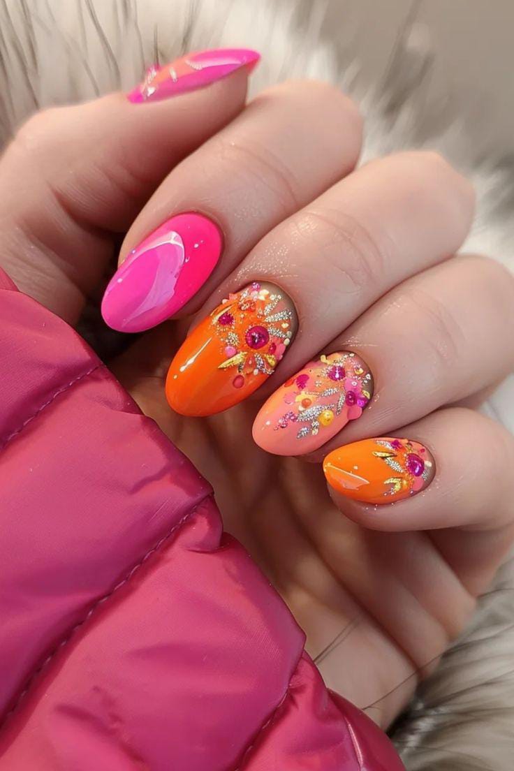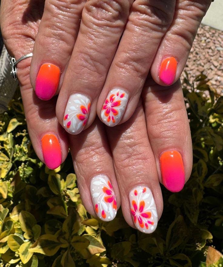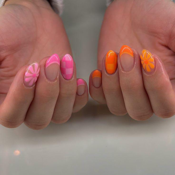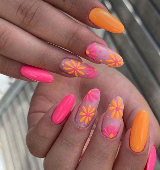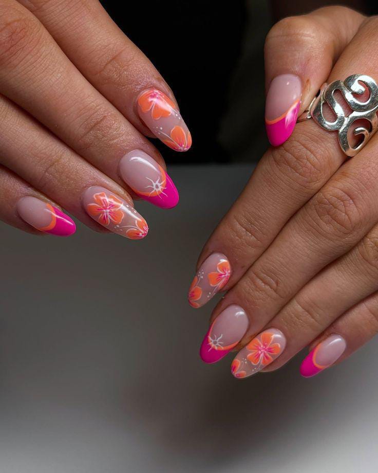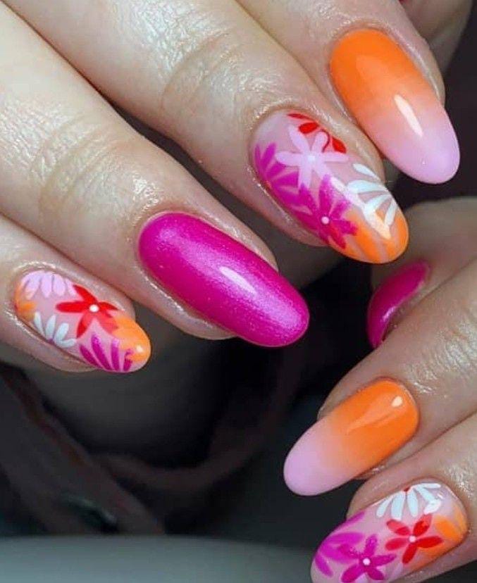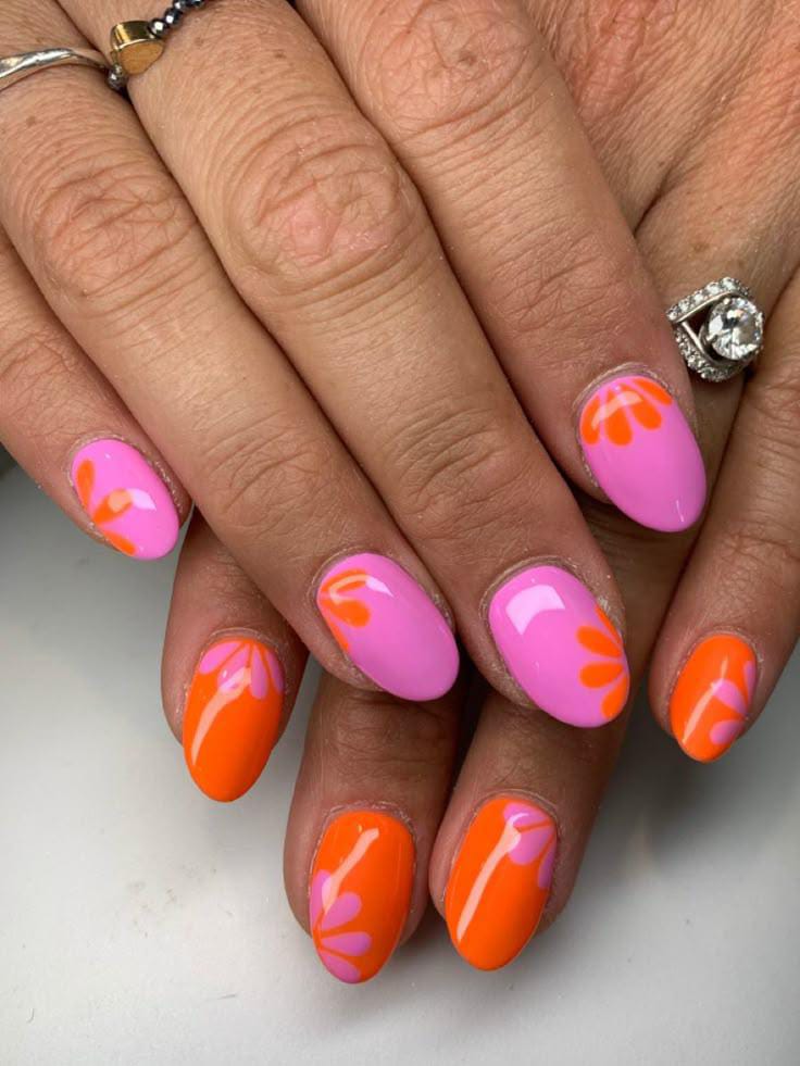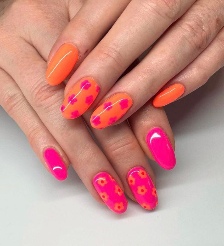 A combination of bright pink and orange nails with soft floral patterns in shades of pink and orange on natural accents, offering a fun and trendy spring vibe with a touch of elegance.