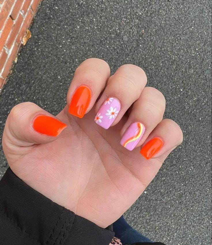 A delicate combination of soft pinks and bright orange nails with floral motifs on accent nails. The floral elements evoke a light and fresh vibe, perfect for spring, and add a subtle yet stunning touch to your nails