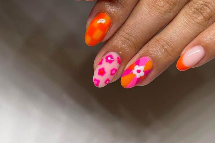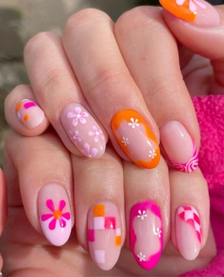 This design features a soft nude, pink with vibrant orange accents and delicate flowers and color blocks with subtle different designs scattered across the nails. The floral patterns give it a fresh, feminine spring touch.