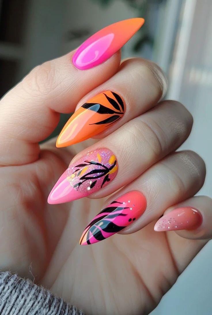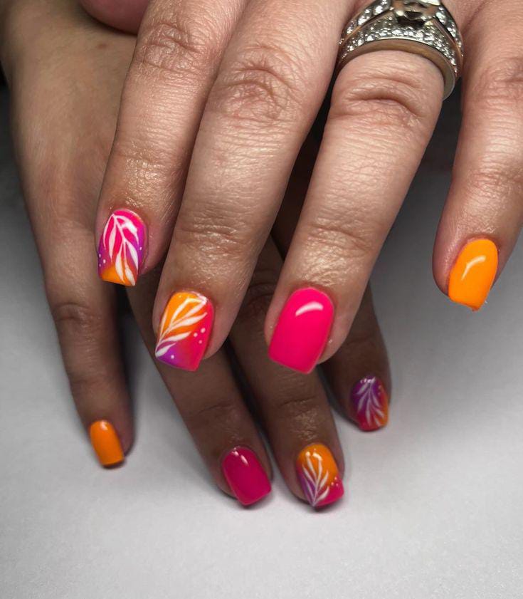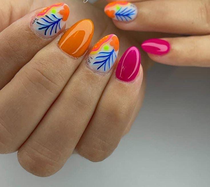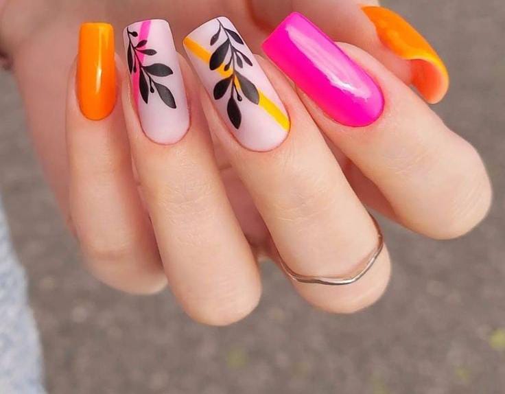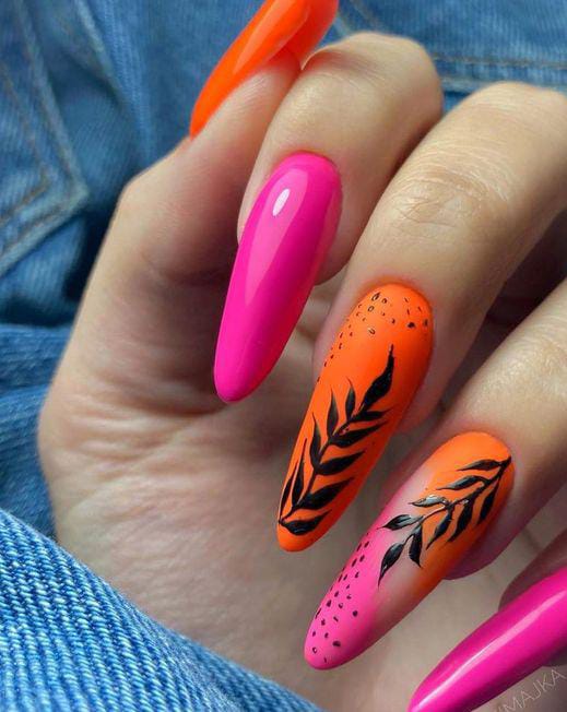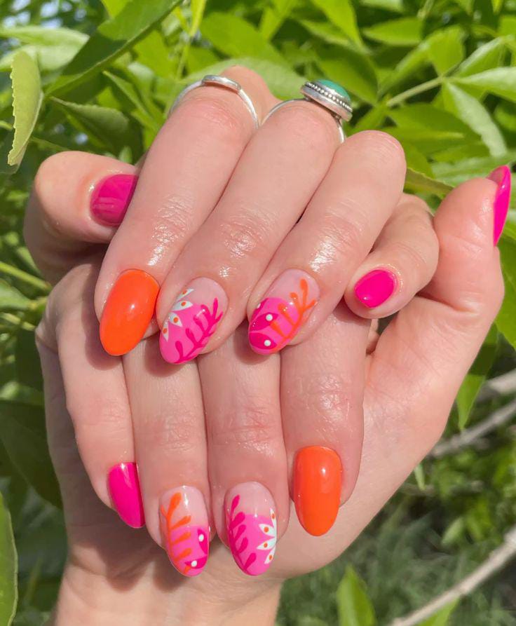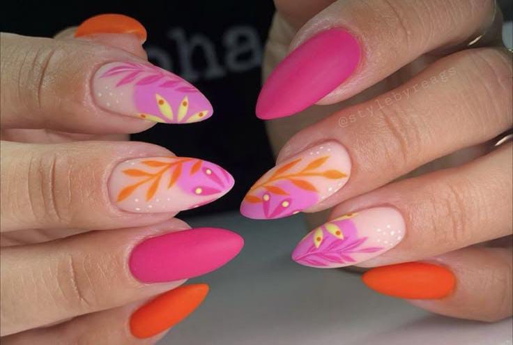 A striking combination of orange and pink nails, accented with bold floral and leaf like patterns in bright colors. This design has a high-energy vibe that perfectly represents the warmth of spring.