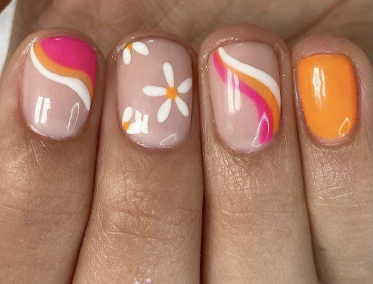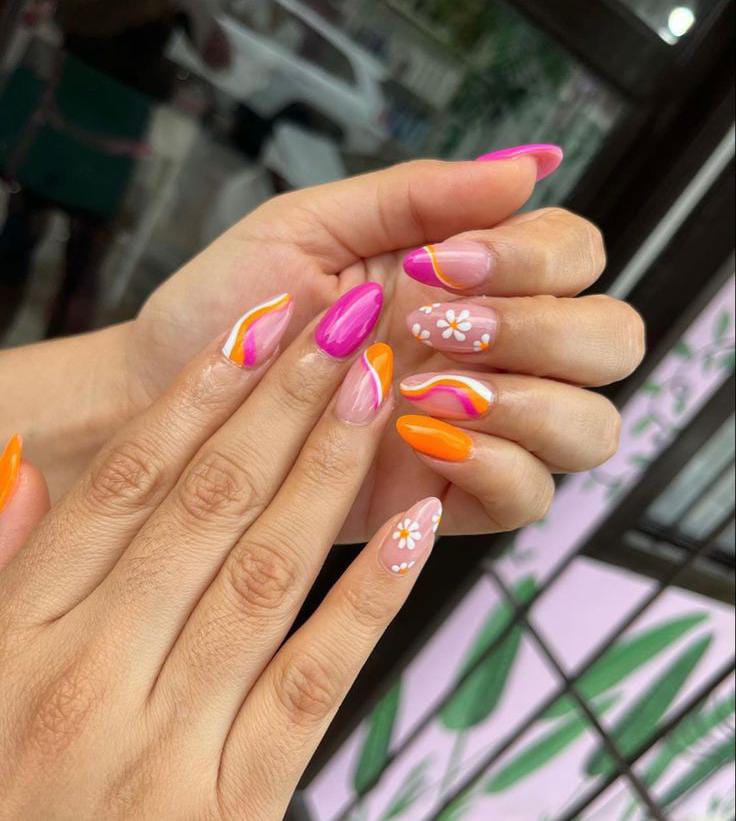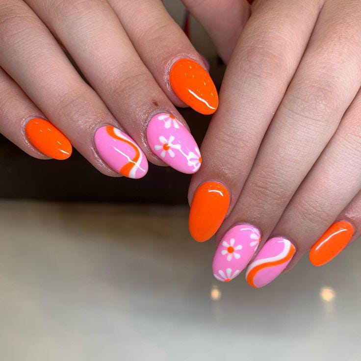 These pink and orange nails features a mix of daisy flower and swirls. The funky patterns create a fun, lighthearted feel, making it an excellent spring choice.