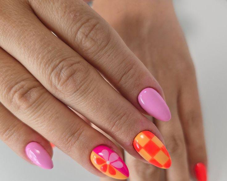 A bold design with bright pink and orange hues, complemented by a flower accent and a fun checkered pattern on one nail. Giving it a fresh and playful spring aesthetic.