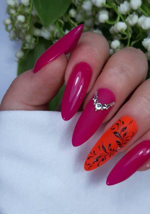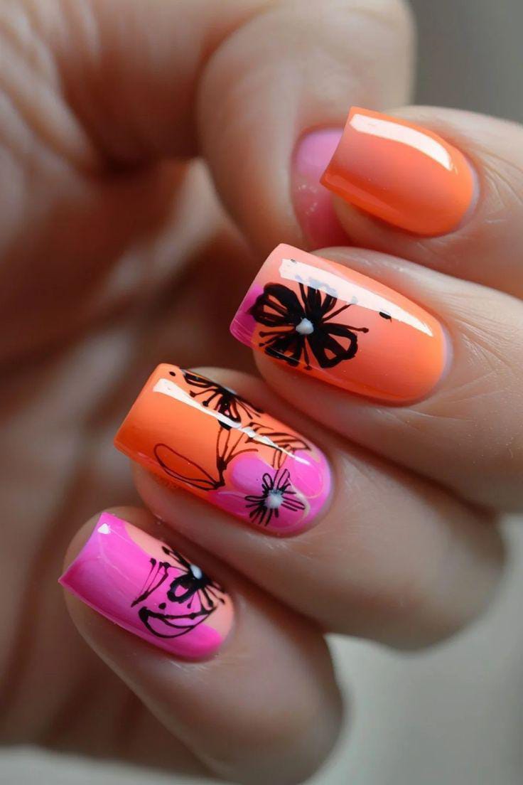 A striking fusion of pink and orange with a touch of intricate black floral art, rhinestones adding an elegant flair to the bold colors. The bold color and cheerful, playful chic spring art.