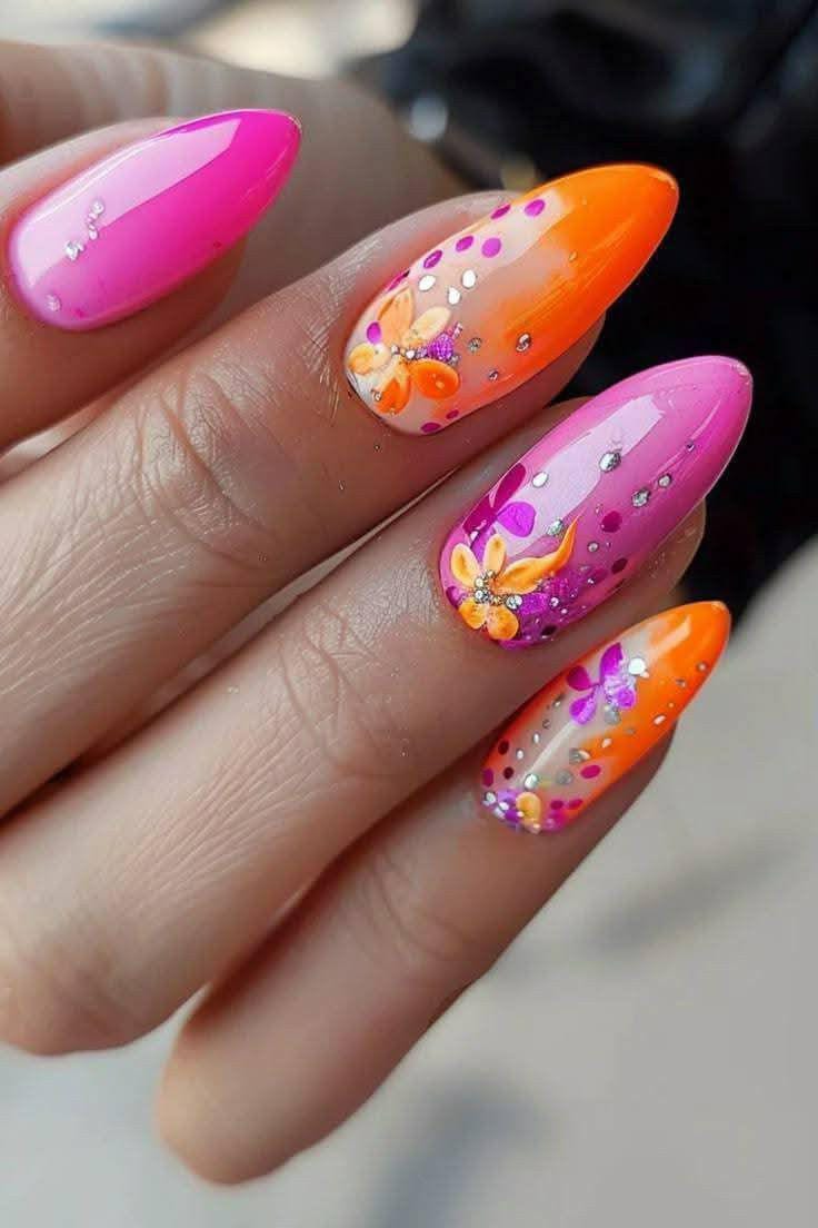 A striking combination of pink, orange and nude ombre gradient nails with intricate floral designs and decorative silver sparkle, adding a playful and vibrant spring look.