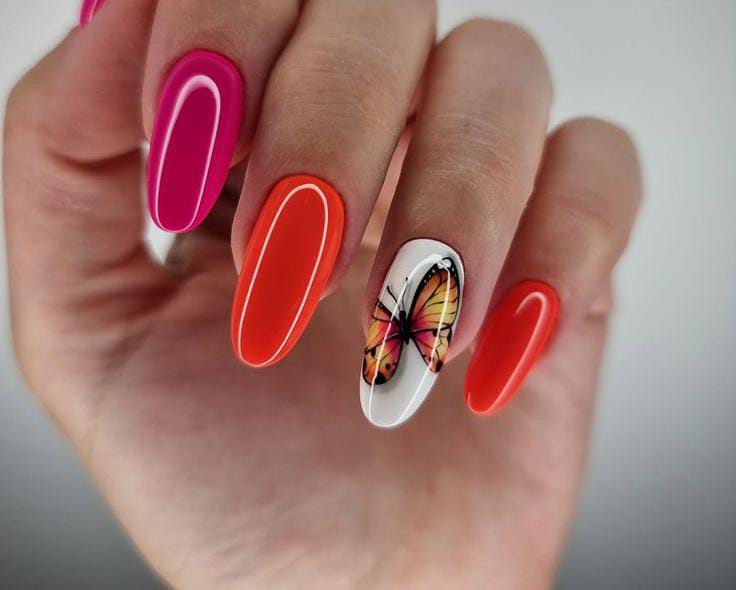 Bright orange and pink nails are paired with a stunning butterfly design on one nail, adding a striking pop of color. This design is vibrant and lively, bringing a cheerful and fun energy, making it ideal for a bold spring statement.
