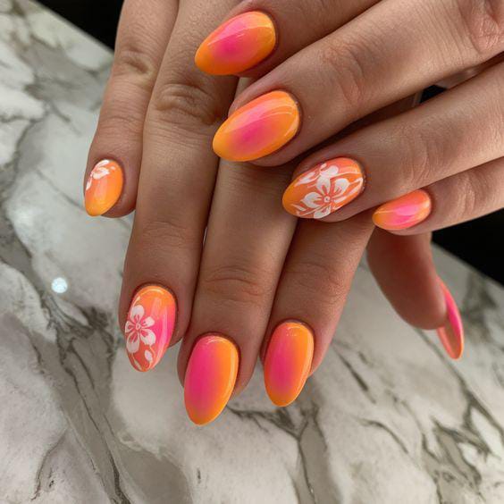 This design uses bright pink to orange ombre nails, with each nail decorated with intricate flower patterns on white nails. It’s a cheerful and colorful design, perfect for the spring season.