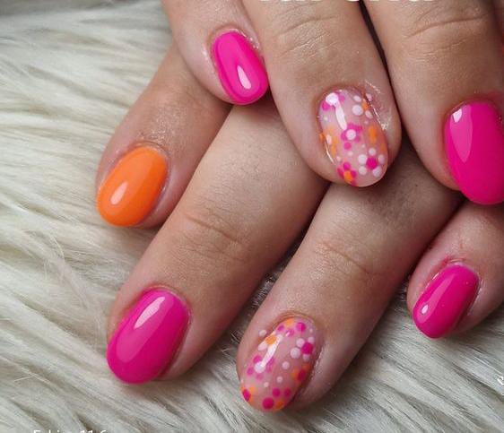 A bright and bold design featuring solid pink and orange nails with a dotted floral pattern on nude nail, offering a fun, youthful spring energy.