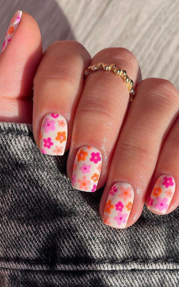 This design features a mix of bright pink and orange shades with delicate floral patterns on nude accents, creating a fun and vibrant spring look.