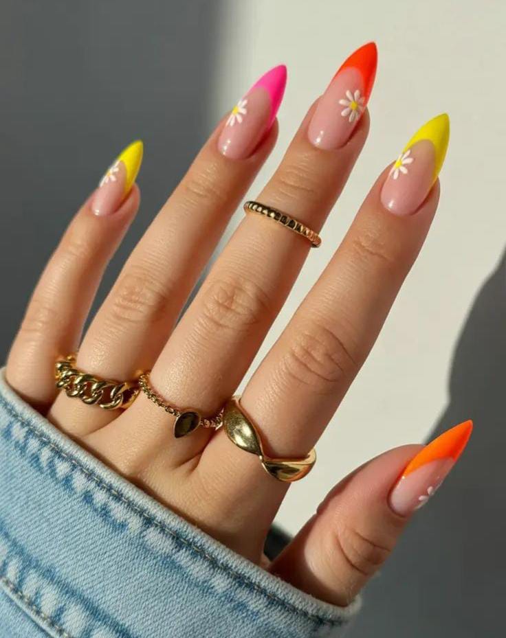 A striking mix of neon gradients blending from pink, yellow and orange french tip nail base, with delicate daisy flower on each nail. It’s perfect for those who love a bit of drama and want their nails to stand out, exuding a modern spring look.