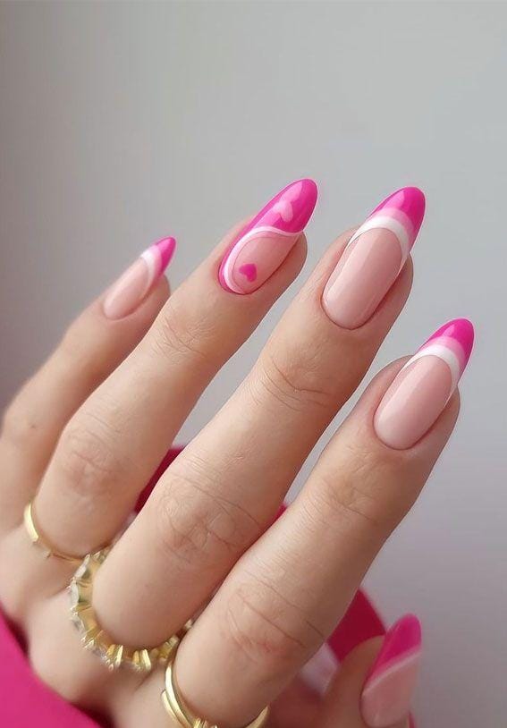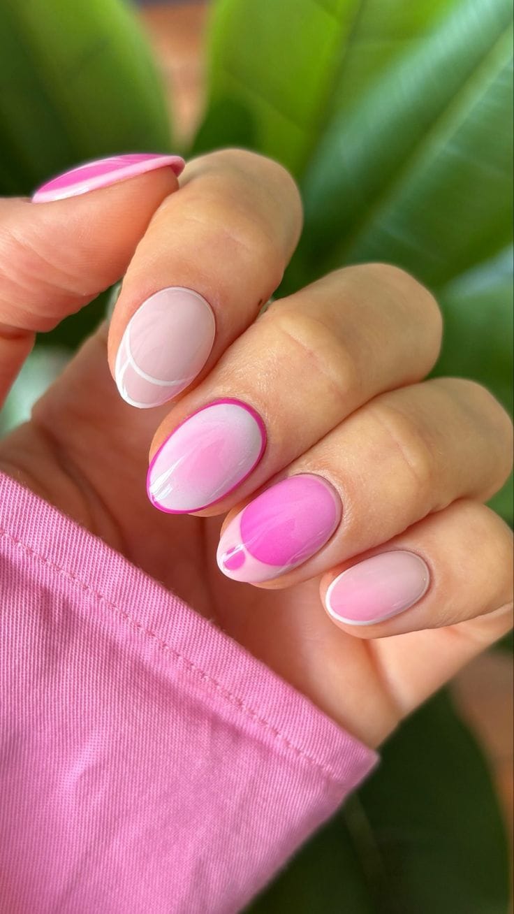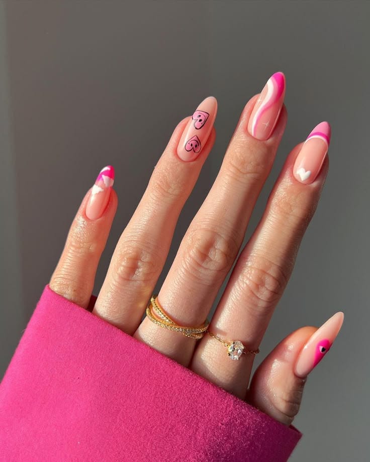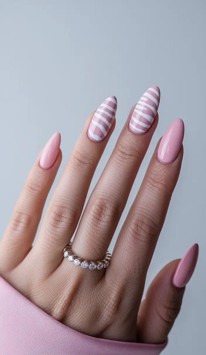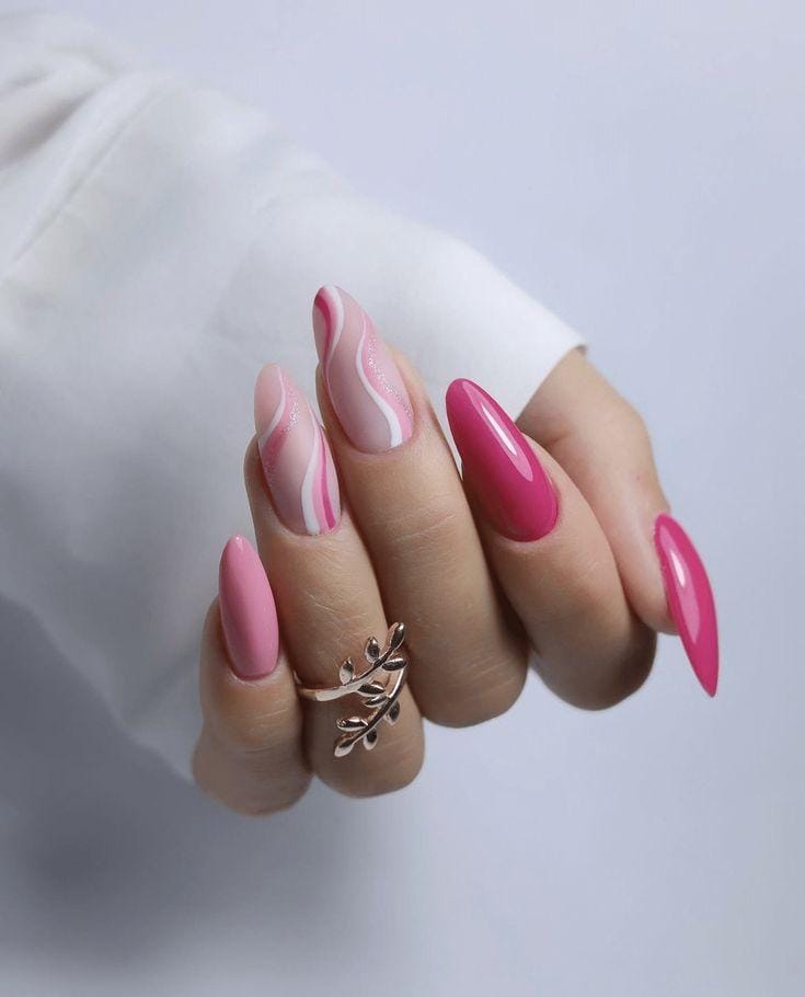 This look mixes solid pink nails with accent nails featuring flowing pink-and-white swirls. It has a bold yet polished vibe that feels trendy while staying elegant.