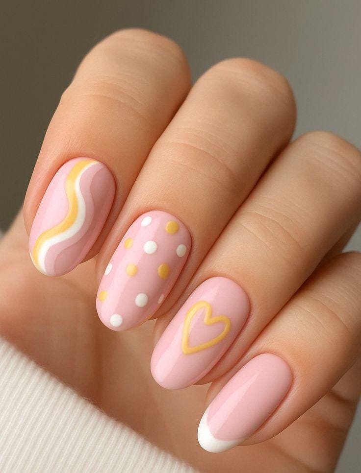 Soft baby pink nails are paired with playful white and yellow accents, including gentle waves, polka dots, and a simple heart detail. The overall vibe is sweet, youthful, and perfect for a light spring look.
