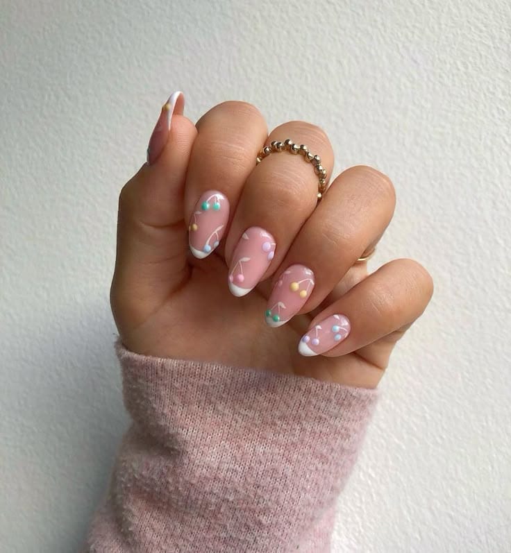 Blush pink nails are decorated with tiny pastel floral and dot details, balanced with clean white tips. The look is cheerful, delicate, and gives off an airy springtime feel.