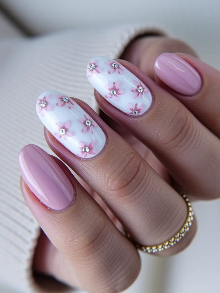 A mix of milky white and dusty pink nails showcases subtle pink florals with small crystal centers. The design feels elegant and romantic, with a gentle sparkle that keeps it refined.