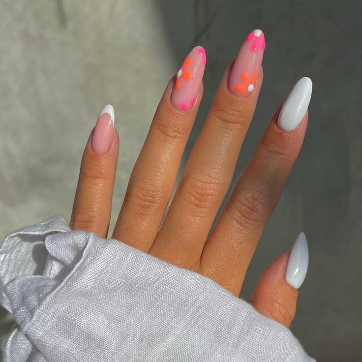 Classic white and pink bases are elevated with bright neon floral accents and sharp French tips. The vibe is bold, sunny, and fun—perfect for a playful spring statement.