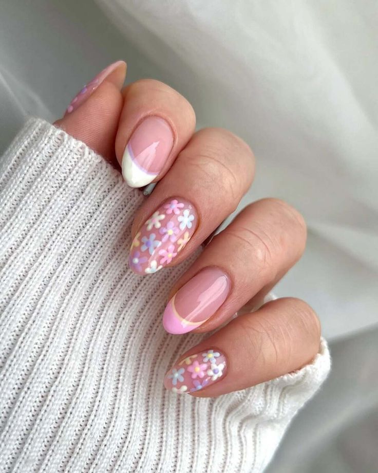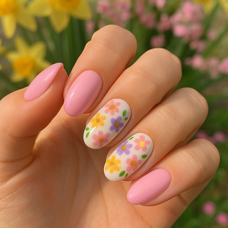 Soft pink nails are paired with creamy white accents decorated with tiny, colorful flowers. The overall vibe is cheerful, playful, and perfect for a springtime floral mood.