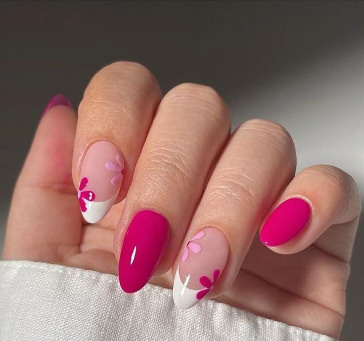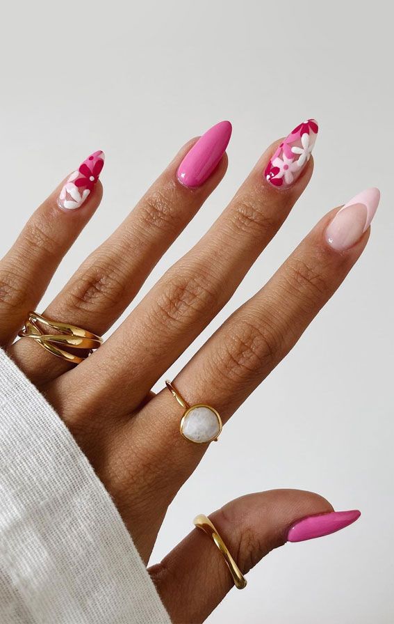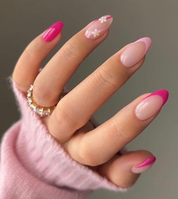 Bright and soft pink shades are balanced with floral accent nails on a neutral base. The style feels cheerful, fresh, and slightly bold without being overwhelming.