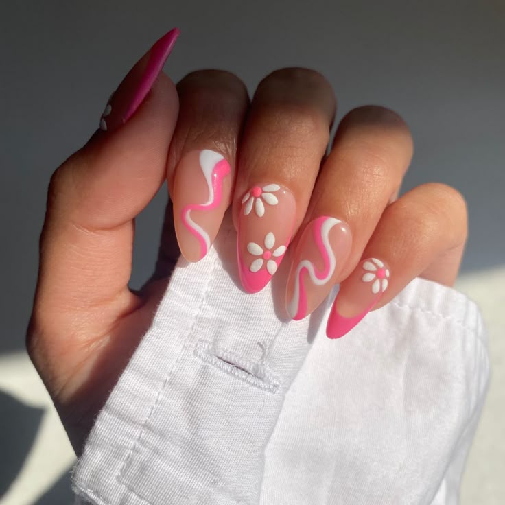 Neutral pink bases are enhanced with flowing pink-and-white swirls, hot pink tips and small daisy-like flowers. The design feels artistic and cheerful, giving off a modern springtime vibe.