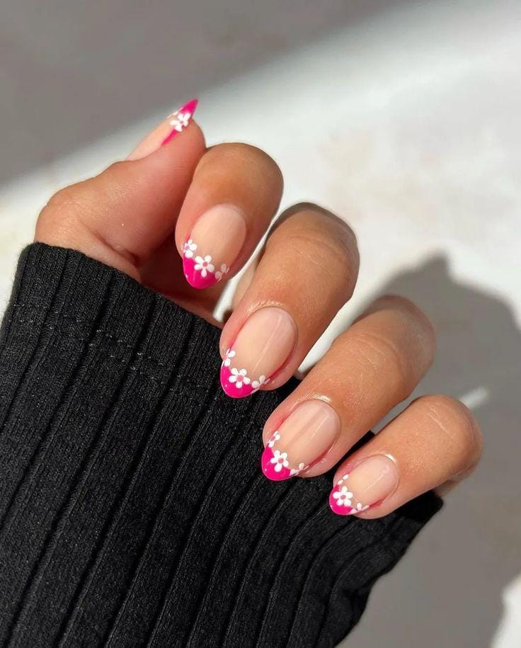Soft nude-pink nails feature bright pink French tips accented with tiny white floral details. The look is fresh, feminine, and perfect for a cheerful spring vibe.