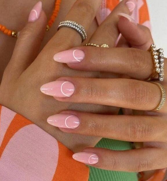 Glossy light pink almond nails are finished with subtle white swirl accents for a modern touch. The design is clean, elegant, and effortlessly spring-ready.