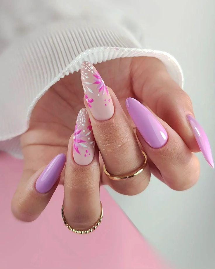 A mix of pastel lavender and blush pink nails paired with white floral accents creates a fresh, playful spring style. The look feels modern yet soft, with a balance of bold color and delicate details.