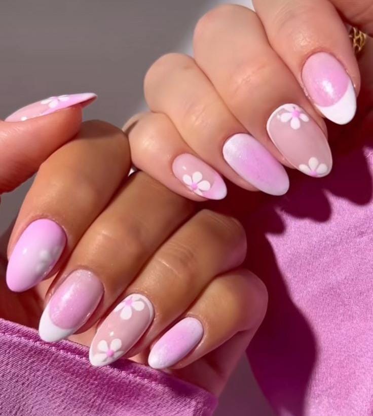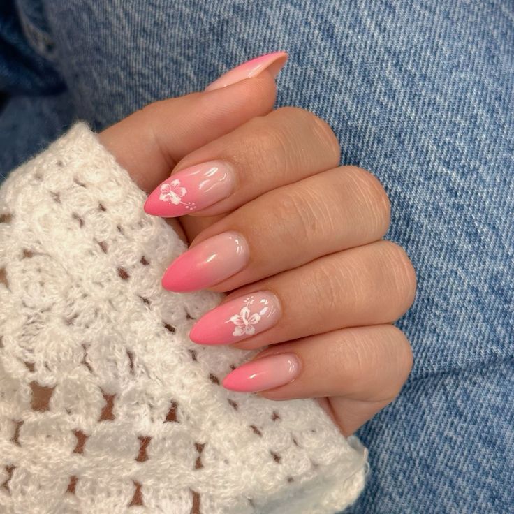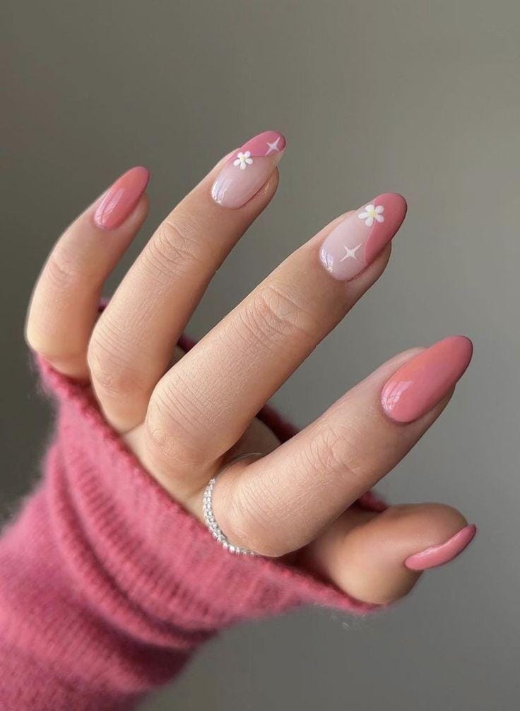 Sheer pink nails fade into deeper pink tips with tiny white flowers for a cute, minimal finish. The design feels youthful, delicate, and effortlessly spring-ready.