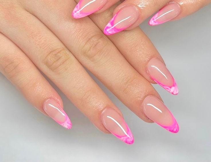 A soft nude base is paired with glossy pink marble French tips for a fresh, modern spring look. The design feels elegant, light, and subtly playful.