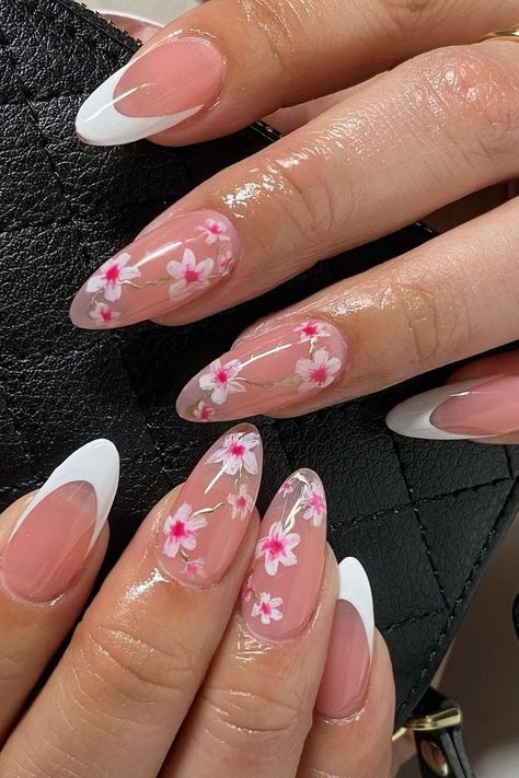 This design mixes classic white French tips with delicate pink floral accents on a sheer nude base. It has a romantic, springtime vibe that feels feminine and airy.