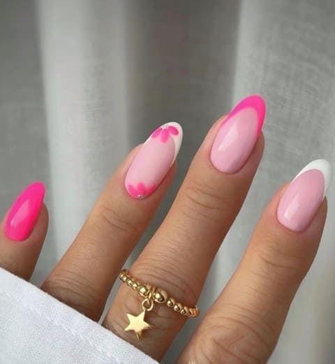 This design combines bright pink statement nails with classic french tips and simple floral details. The contrast creates a playful yet polished spring look that feels fun and confident.