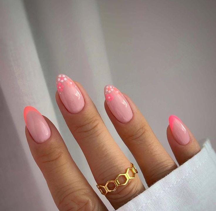 Soft blush pink nails are paired with neon-tipped French accents and tiny floral dot details. The look feels fresh, feminine, and playful—perfect for early spring vibes.
