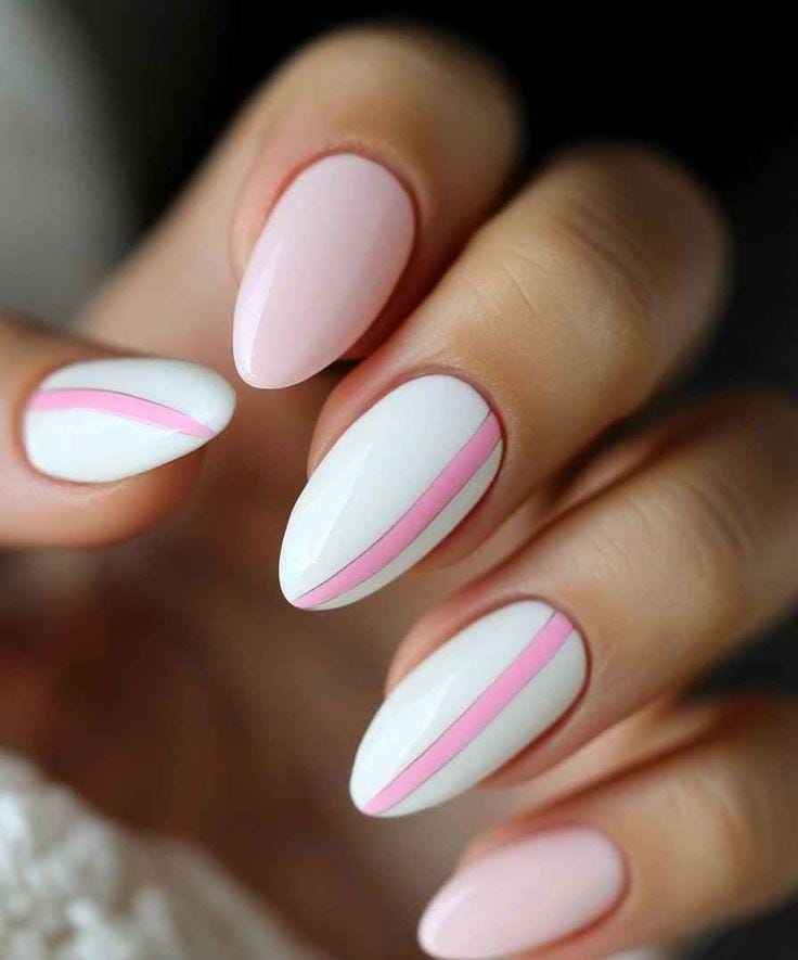 A clean mix of milky white and pale pink nails is accented with thin pink center stripes. This design is sleek, modern, and effortlessly elegant.
