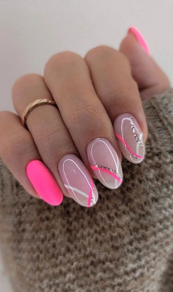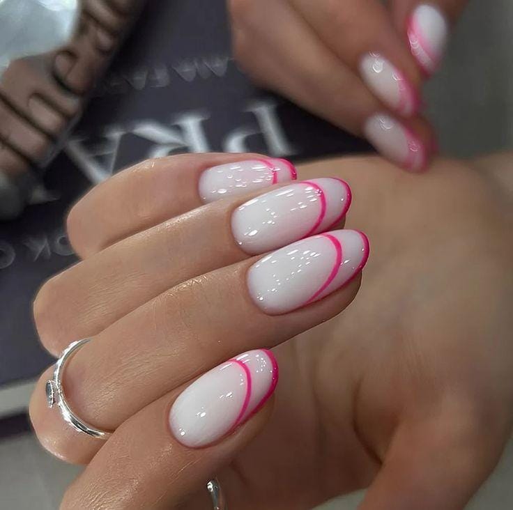 A bold pink accent nail pairs with sheer bases and flowing white lines for a clean, contemporary feel. The design is sleek, fresh, and slightly edgy while still spring-ready.